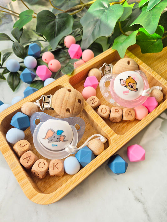 Soother clips that can be personalised. The Perfect gift to welcome a new baby to the world, or as a gift for their Christening Day.